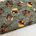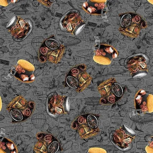 Indulge in the steampunk fantasy world with Urban Essence Designs' new Time Travel range! There are 14 fabric designs in this collection which feature, a stunning 24-inch panel made up of vintage hats, airships, bicycles and trains. Other patterns include airships, bees, dragonflies, blueprints, timepieces, gears, hats, keys, pipes, skulls and postal stamps, all in a one-of-a-kind teal, grey, copper, bronze and gold palette. Let this retro-futuristic fabric take you away!