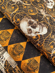 Happy Halloween,  this sophisticated Halloween collection is in rich earth tones of grey, dusty orange and black, these fabrics will work well with home décor projects as well as quilts. The designs include  black crows, spiders, eyes, bats, black roses, suns and moons and owls.