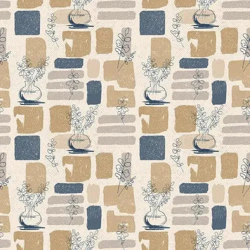 Modern Abstractions, Vases make a great addition to any crafting project. The soft, cotton fabric features a light stone background with vases and blocks of colour in grey, tan and blue, for a modern look. Perfect for quilting, sewers will love its soft feel and easy to use design.