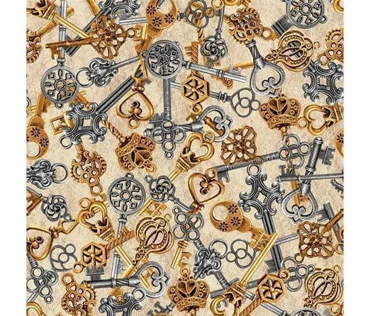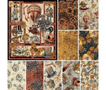 Designed by Urban Essence for Blank Textiles. This collection was inspired by steampunk styled art, fashion and mechanics. It is colored in rich neutral colors like rust, copper, and parchment that are reminiscent of metals and vintage newspapers. The designs include a 36 inch panel with a hot air balloon, top hats, butterflies, clocks, scissors, keys, nautical motifs, gears and vintage bicycles. These fabrics are great for a multitude of projects from quilts to home decorating