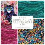 Step into the enchanting world of Gigi in the Garden, a quilting cotton fabric collection that brings stained glass garden imagery to life in a kaleidoscope of vibrant jewel tones. Featuring Gigi the Cat panel amidst intricate butterflies, pansies, lilies, and succulents, this collection mirrors the mesmerising hues and ornate patterns of a stained glass garden, inviting you to create magical projects with rich colours and stunning prints.