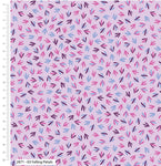 A pale lilac background highlights the bright pink, purple and blue falling petals on this design. The soft drape and quilting weight of the fabric makes it perfect for quilts and home decor accents.