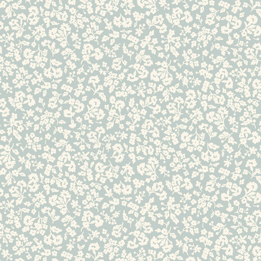 The Dainty Meadow print from the Denim Floral collection has a light blue/grey background with tiny florals in off white in an all over pattern.