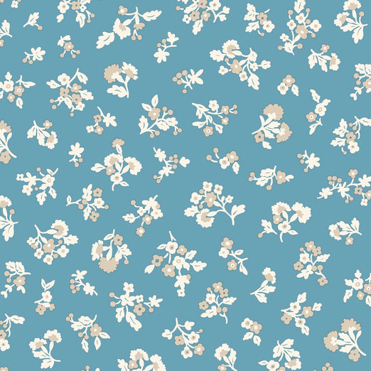The Tumbling Blooms print from the Denim Floral collection has a light blue background with tiny florals in off white and ochre in a scattered all over pattern.