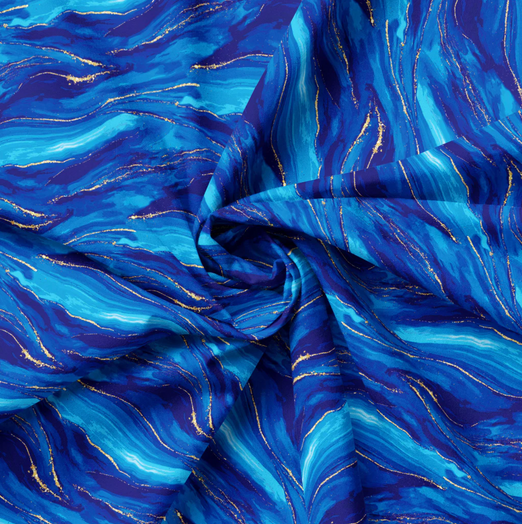 Gilded Collection-Gilded Waves Metallic Blue and Gold.  Indulge in the opulence of Gilded, a quilting cotton fabric collection where luxury meets tradition, blenders by Camelot Design Studio adorned with abstract waves, gentle ripples and tufted diamond textures in neutrals and jewel tones glisten with rich gold metallic ink accents.