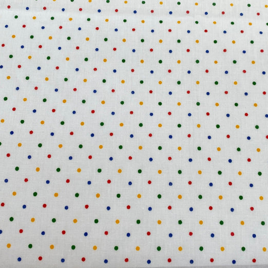 Tiny spots in blue, green, yellow and red are on this bright white Polycotton fabric lightweight Polycotton for dressmaking and crafting