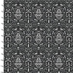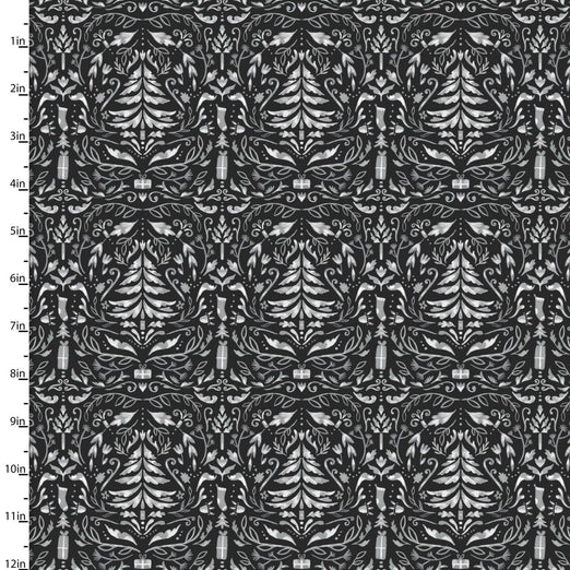 Designed by Elaine Kay for 3 Wishes Fabrics, this Damask Black cotton fabric is digitally printed, has a black background with Christmas Trees, foliage and presents in a damask design. It's a beautiful Christmas design.