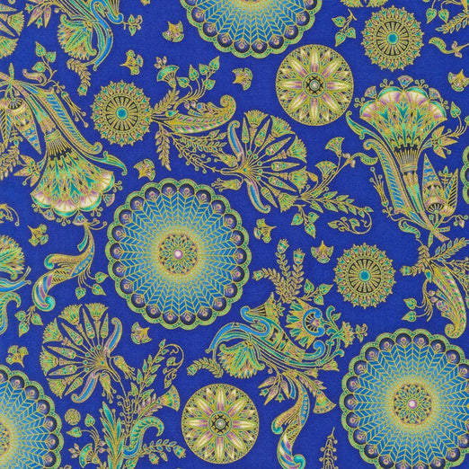 Sapphire, Ancient Beauty Indulge in the timeless elegance of Sapphire, Ancient Beauty, Robert Kaufman fabric. The stunning gold metallic design on a sapphire blue background adds a touch of luxury...