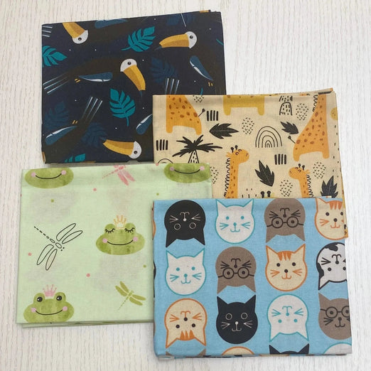 We have toucans, frogs, cats and giraffes what a comical mix up of animals! This bundle has 4 fat quarters to make into cushions, quilts and lots of craft projects.