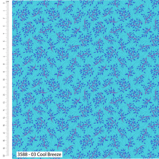Printed cotton fabric by The Craft Cotton Company, featuring stems and leaves in an all over print on a bright blue background. A great design for background fabric, sashing, and quilt backing along with bag making and craft projects.