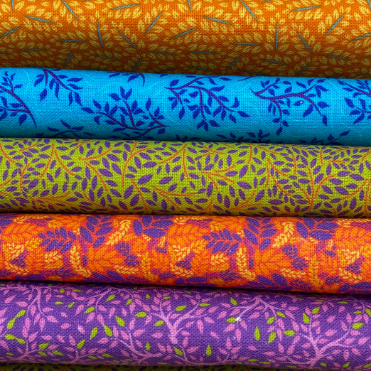 Printed cotton fabric by The Craft Cotton Company, featuring  small prints of leaves and stem designs in various sizes in an all over print on different backgrounds. Great designs for background fabric, sashing, and quilt backing along with bag making and craft projects.