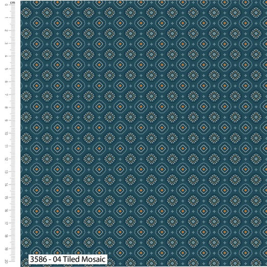 Printed cotton fabric by The Craft Cotton Company, featuring small geometric designs on a dark blue background. A great design for background fabric, sashing, and quilt backing along with bag making and craft projects.