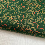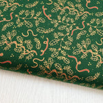 Beautiful traditional Christmas design of green holly leaves with gold metallic thread on a green background. this design also has red ribbons floating through the background, it is suitable for crafts, table runners, quilting projects, cushions and and lots more.
