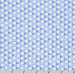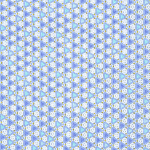 Tiny triangles and hexagons in various shades of blue with little stamps of gold metallic thread at the points in an all design. A stunning fabric collection for special sewing and quilting projects.
