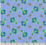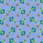 Flowers, stems and leaves in beautiful shades of blue and green with delicate swirls of dots in gold metallic thread at the points in an all design. A stunning fabric collection for special sewing and quilting projects.