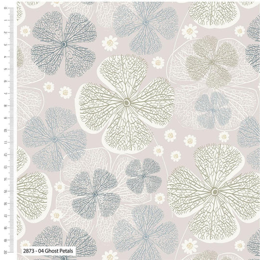 Has a light grey background this design is completely different as florals usually go, the petals are stripped back to show the veins in each, such a clever design for a floral fabric