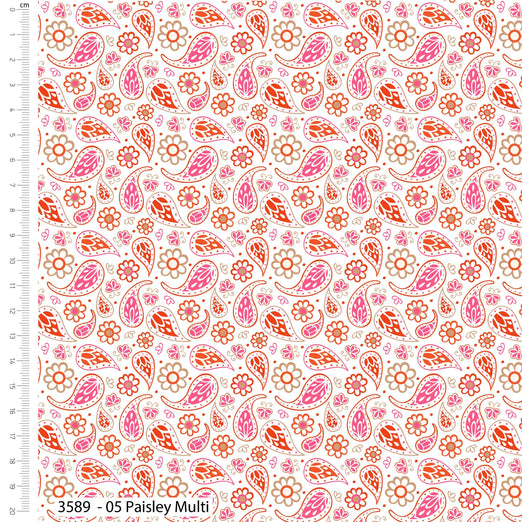 Paisley Multi, Sunset Paisley Printed cotton fabric by The Craft Cotton Company, featuring  paisley designs in various sizes in an all over print on a red background. A great design...