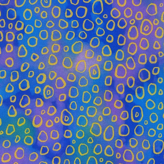 Beautiful blues and shades of purples in a marbled effect with gold metallic thread in an all over small circle design. A stunning fabric collection for special sewing and quilting projects.