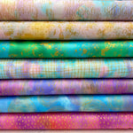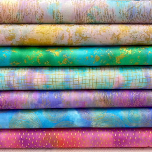 The prettiest shades in marbled effects with gold metallic thread in all over designs. A stunning fabric collection for special sewing and quilting projects.