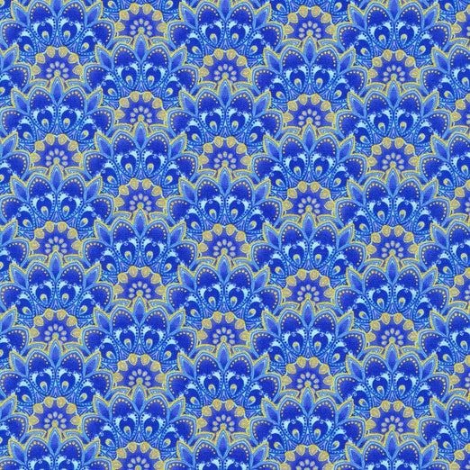 Stunning design in beautiful shades of blue with gold metallic thread at the points in an all design. A stunning fabric collection for special sewing and quilting projects.