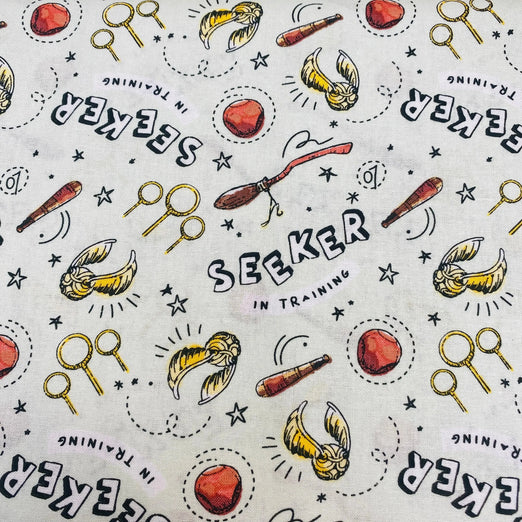 Calling all Harry Potter fans! This cotton fabric is for you. Featuring the slogan "Seeker in Training," this fabric is perfect for quidditch fans. The pale mint background makes it easy to match with lots of color scheme. Use this fabric to create unique and personalized Harry Potter-themed projects.
