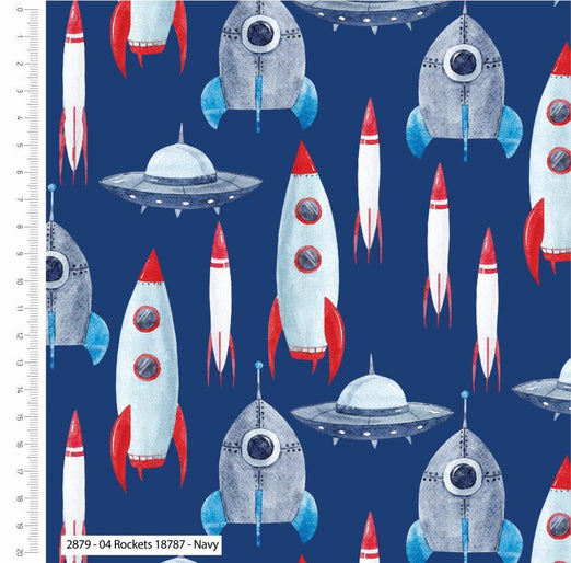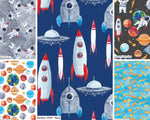 Rockets A blue background with rockets and space crafts all zooming up to space! A great design for all future space children. Other designs available in the range. 100% cotton....