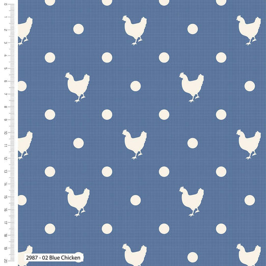 Introducing "Blue Skies, Chickens" by Stuart Hillard – a playful cotton fabric, with a calming blue background, and a delightful print of chickens and dots in white. Add a touch of country charm to your next project!