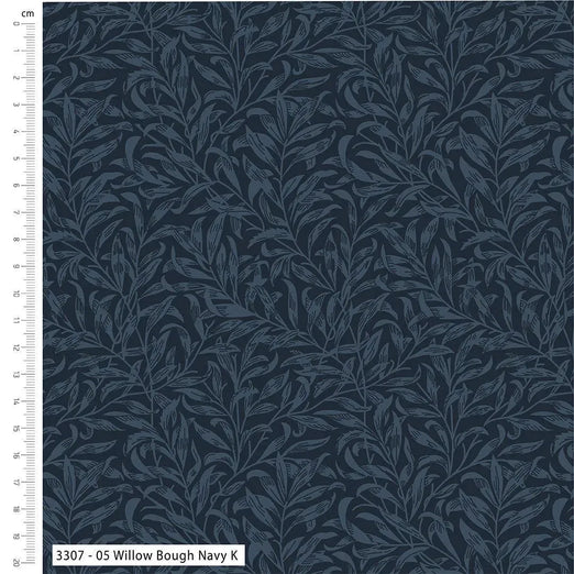 A classic work of art, the Willow Bough Navy by William Morris. Its intricate leaves, in a slightly lighter shade of blue against , a navy background bring a touch of timeless beauty to any space. Perfect for adding a touch of William Morris design to any sewing project.
