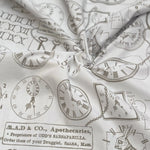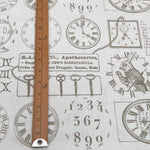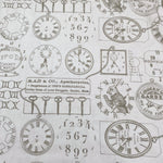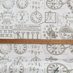 Mad Masquerade by J. Wecker Frisch for Riley Blake Designs is great for quilting, garments, costumes and home decor. This digitally-printed fabric features images of clocks, keys, roman numerals and pocket watches in light grey on a white background, it also has script from Alice in Wonderland.