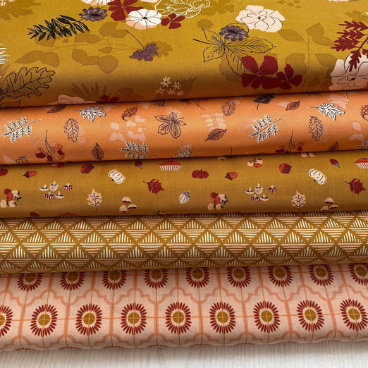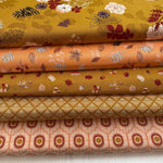 The Maple collection by Gabrielle Neil Design for Riley Blake Designs, scattered flowers in gold on a pink background. There are other fabrics in the range in beautiful Autumnal shades, for quilting, dressmaking and craft projects.