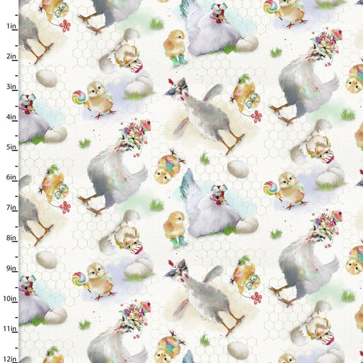With our chickens and chicks cotton fabric It's like a day at the farm without having to leave the city! Farm fresh chickens and eggs just in time for Easter! These colorful chickens and their eggs are sure to add charm to your Easter decorations. Made from 100% cotton, this fabric is perfect for quilting, crafts, and so much more!