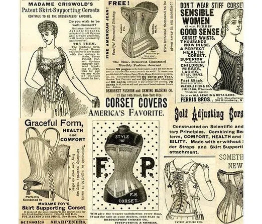 Corset Ads Parchment This quilting cotton fabric features vintage illustrations of ladies in corsets with slogans in type stating Health and Comfort! The line drawings and type in black...