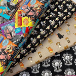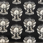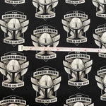 Decorate your world with Camelot Licensed Fabric's newest licensed fabric featuring the hit movie "The Child (aka Baby Yoda) from the Star Wars Mandalorian Series. This licensed cotton fabric features the Mandalorian Helmet Badges in white and grey on a black background. Use for quilting, apparel, home decor, and so much more.